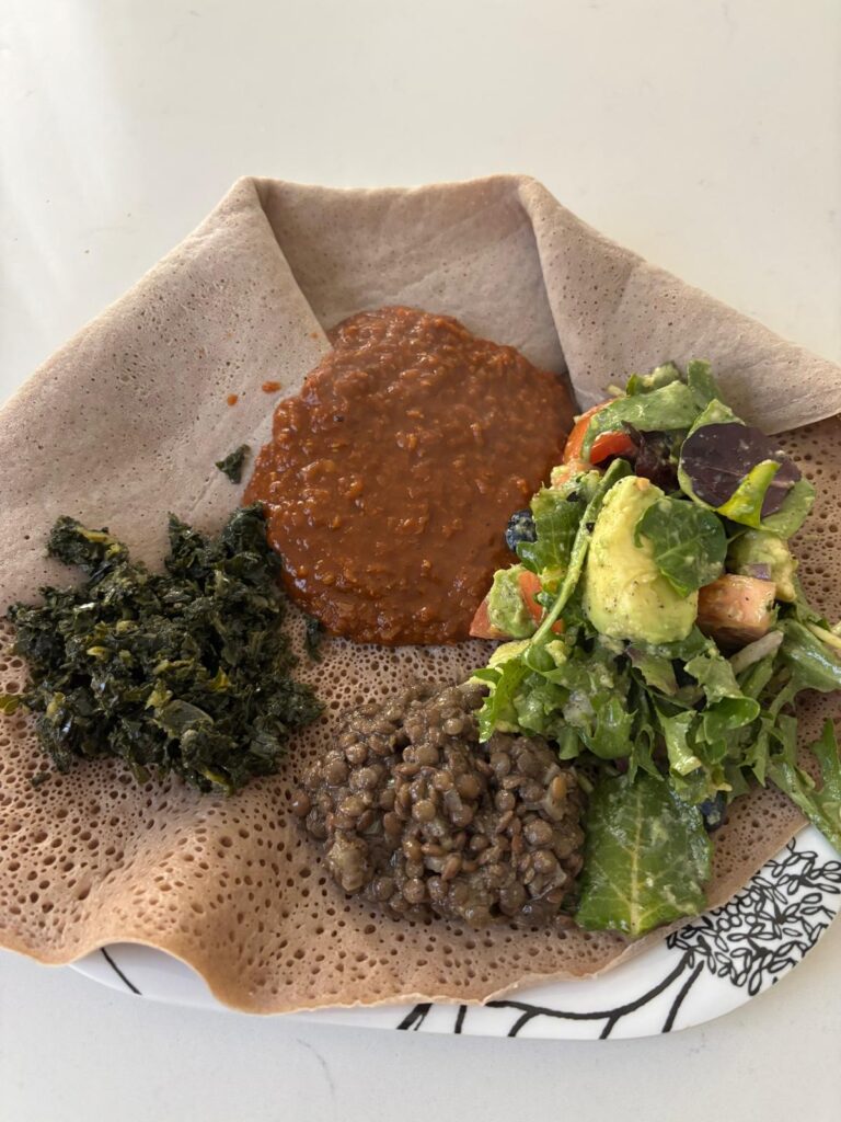 En el centro de cada mesa etíope encontramos el injera, un pan esponjoso y ligeramente ácido que sirve tanto de plato como de cubierto. Elaborado con harina de teff, un grano ancestral originario de las tierras altas de Etiopía, el injera es mucho más que un alimento: es un símbolo de hospitalidad y comunidad.