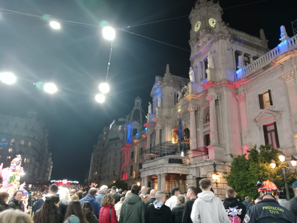Vista nocturna de la Plaza del Ayuntamiento llena de visitantes 15 de marzo 2026 esperando el fuego artificial