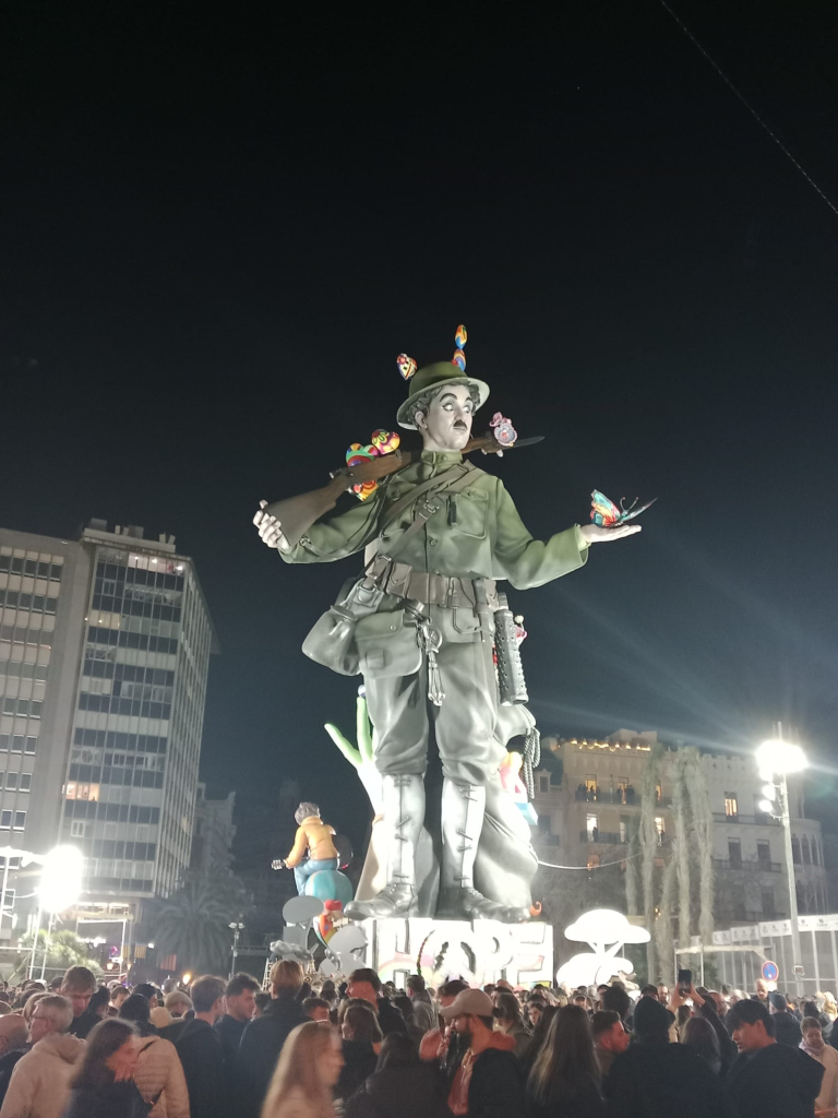 El enorme ninot de Charlie Chaplin, instalado en la Plaza del Ayuntamiento, se convirtió en una figura aún más impresionante bajo la luz de los fuegos artificiales. Su silueta, iluminada por las explosiones de colores, ofrecía una imagen única que muchos visitantes describieron como uno de los momentos más mágicos de las Fallas.
