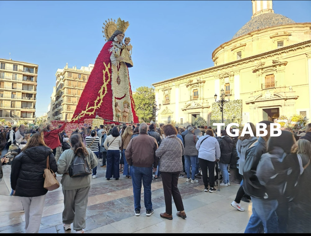 La Plaza de la Reina se llena de falleros y falleras vestidos con trajes tradicionales que desfilan para entregar flores, creando un impresionante manto floral lleno de color y tradición.